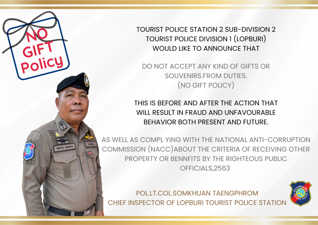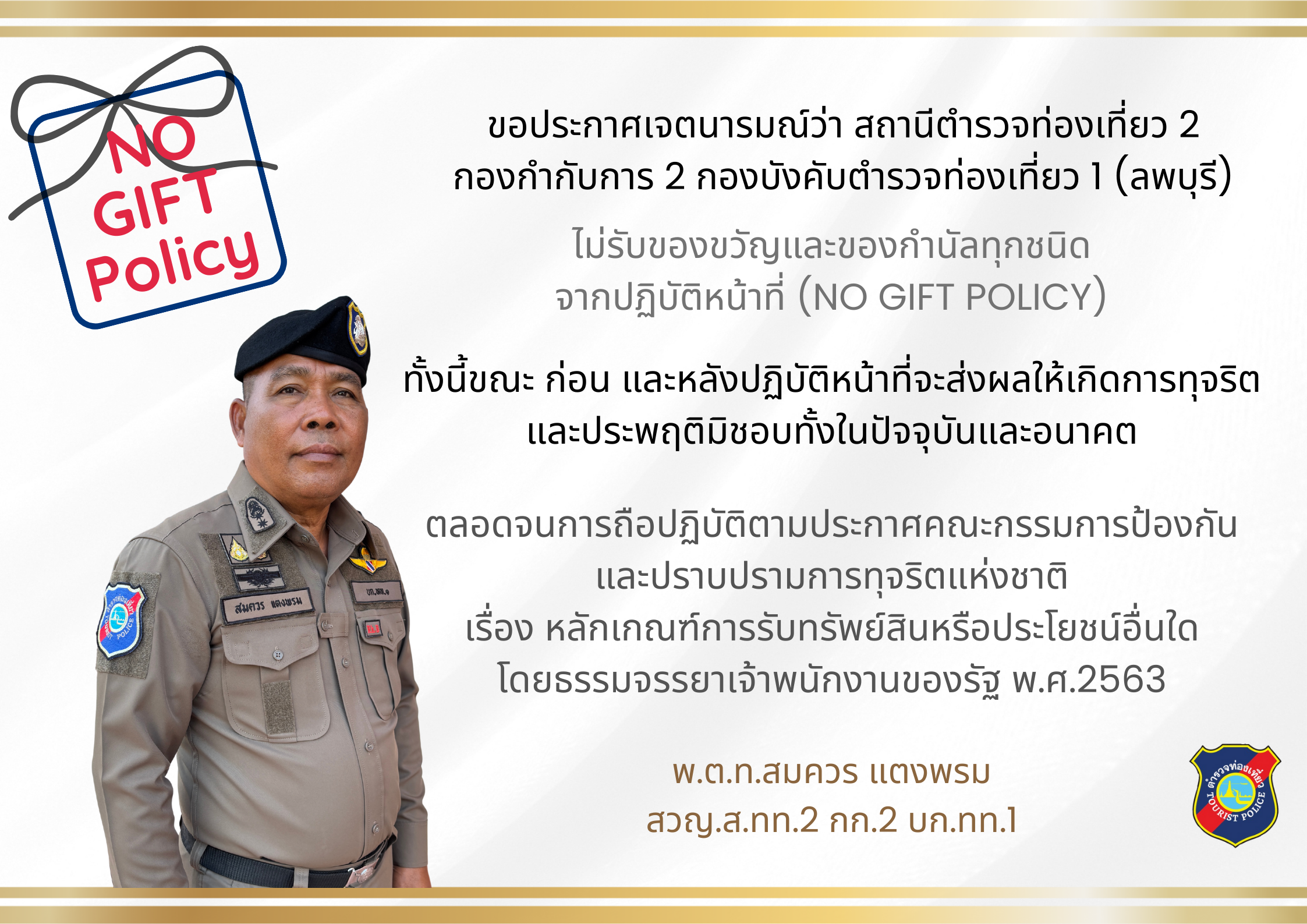 ประกาศกองบัญชาการตำรวจท่องเที่ยว เรื่องเจตนารมณ์ที่จะไม่รับของขวัญและของกำนัลทุกชนิดจากการปฏิบัติหน้าที่