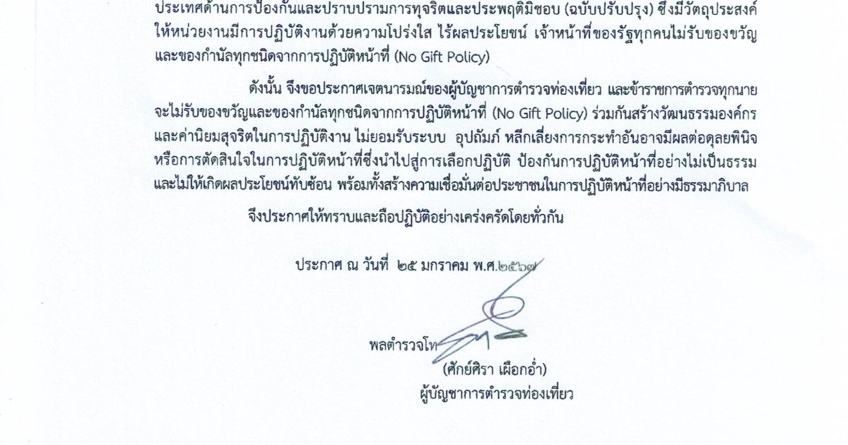 ประกาศกองบัญชาการตำรวจท่องเที่ยว เรื่องเจตนารมณ์ที่จะไม่รับของขวัญและของกำนัลทุกชนิดจากการปฏิบัติหน้าที่