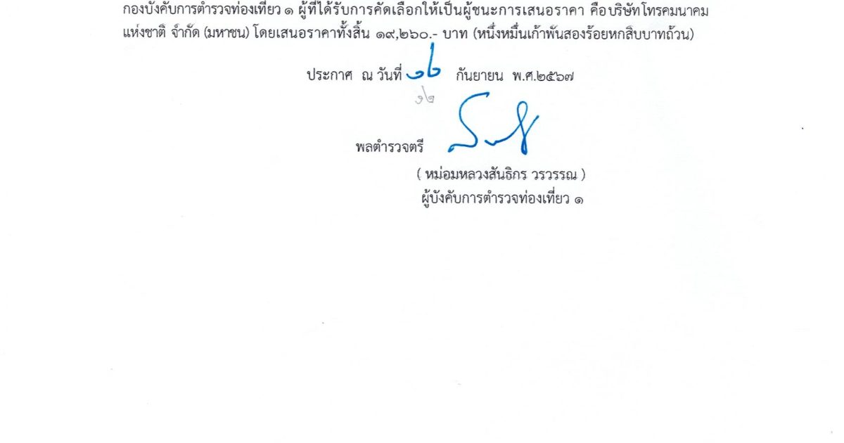 ประกาศ กองบังคับการตำรวจท่องเที่ยว 1 เรื่อง ประกาศผู้ชนะการเสนอราคาการจัดเช่าสัญญาณอินเตอร์เน็ต เพื่อใช้ในอาคารที่ทำการของ สถานีตำรวจท่องเที่ยว 2 กองกำกับการ 2 กองบังคับการตำรวจท่องเที่ยว 1 ประจำปีงบประมาณ 2568 (ตุลาคม 2567 – กันยายน 2568) โดยวิธีเฉพาะเจาะจง
