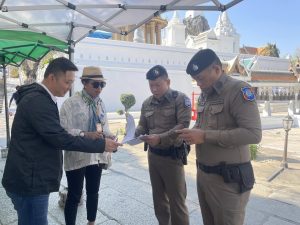 จึงกำชับให้สายตรวจออกดูแลความปลอดภัยอำนวยความสะดวกให้นักท่องเที่ยวที่มาท่องเที่ยวภายในวัด และได้นำสายตรวจตรวจสอบไกด์นำเที่ยวให้ปฏิบัติตามกฎหมาย และตรวจใบสั่งงาน Job Order พร้อมให้ทำการประชาสัมพันธ์สายด่วน 1155 และแอปพลิเคชั่น Thailand Tourist Police ให้แก่นักท่องเที่ยว