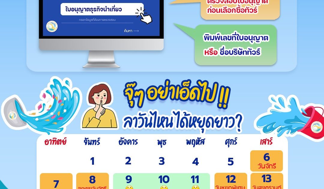 กรมการท่องเที่ยว จึงขอแนะนำให้ทุกท่านซื้อทัวร์จากบริษัทที่มีใบอนุญาตธุรกิจนำเที่ยว ว่ามีใบอนุญาตถูกต้องหรือไม่ ข้อมูลนี้ตรวจสอบได้ที่เว็บไซต์กรมการท่องเที่ยว www.dot.go.th หัวข้อ License Check ตรวจสอบใบอนุญาตก่อนซื้อทัวร์ พิมพ์เลขที่ใบอนุญาตหรือชื่อบริษัททัวร์ ได้ด้วยตนเองตลอด 24 ชั่วโมง หรือติดต่อ call center 0 2401 1111 ได้เลยค่ะ