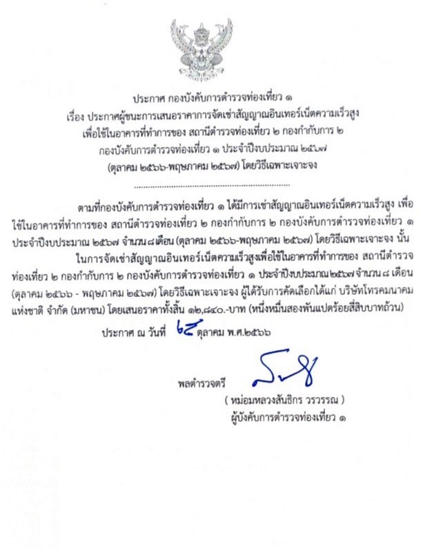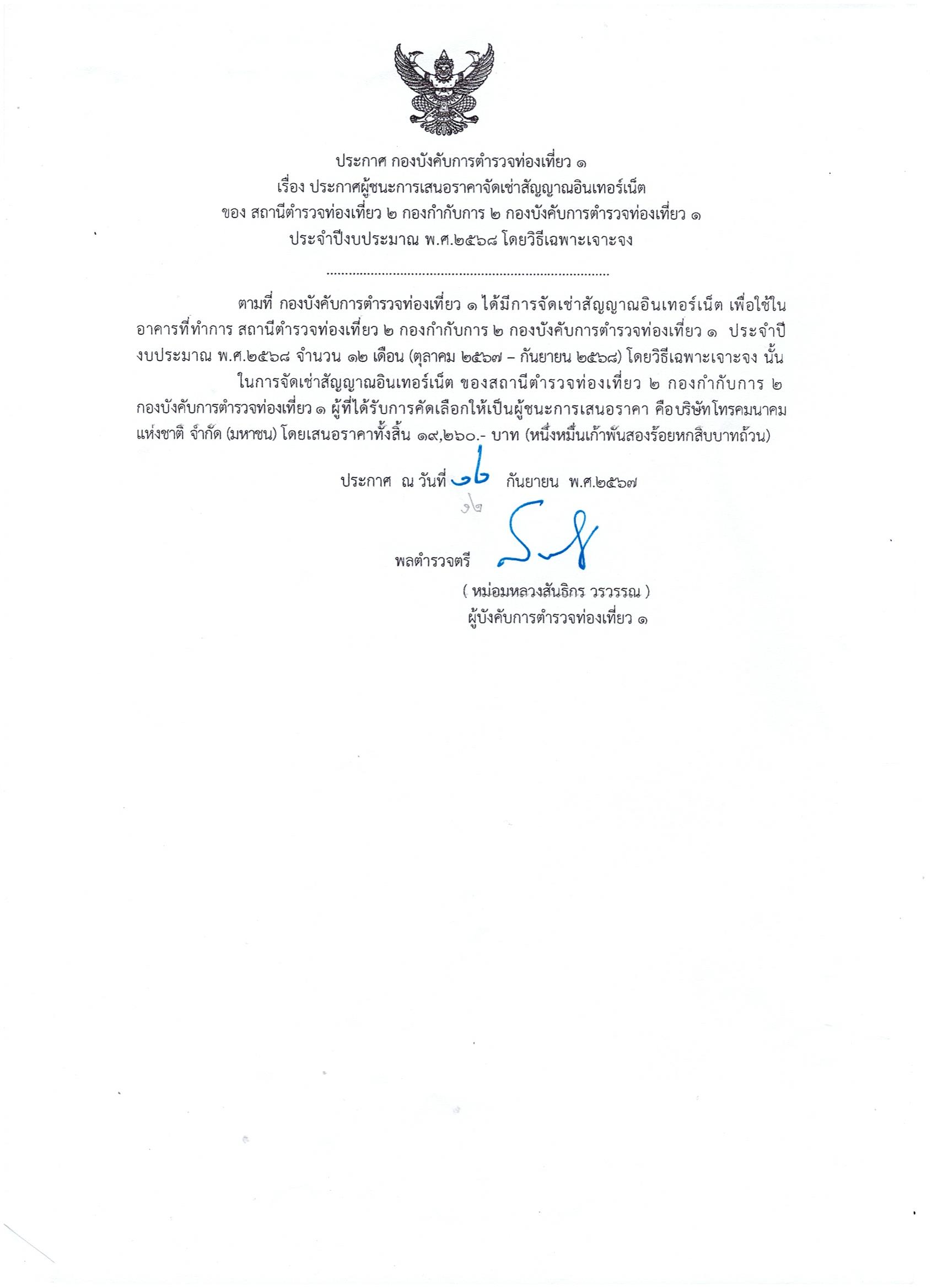 ประกาศ กองบังคับการตำรวจท่องเที่ยว 1 เรื่อง ประกาศผู้ชนะการเสนอราคาการจัดเช่าสัญญาณอินเตอร์เน็ต