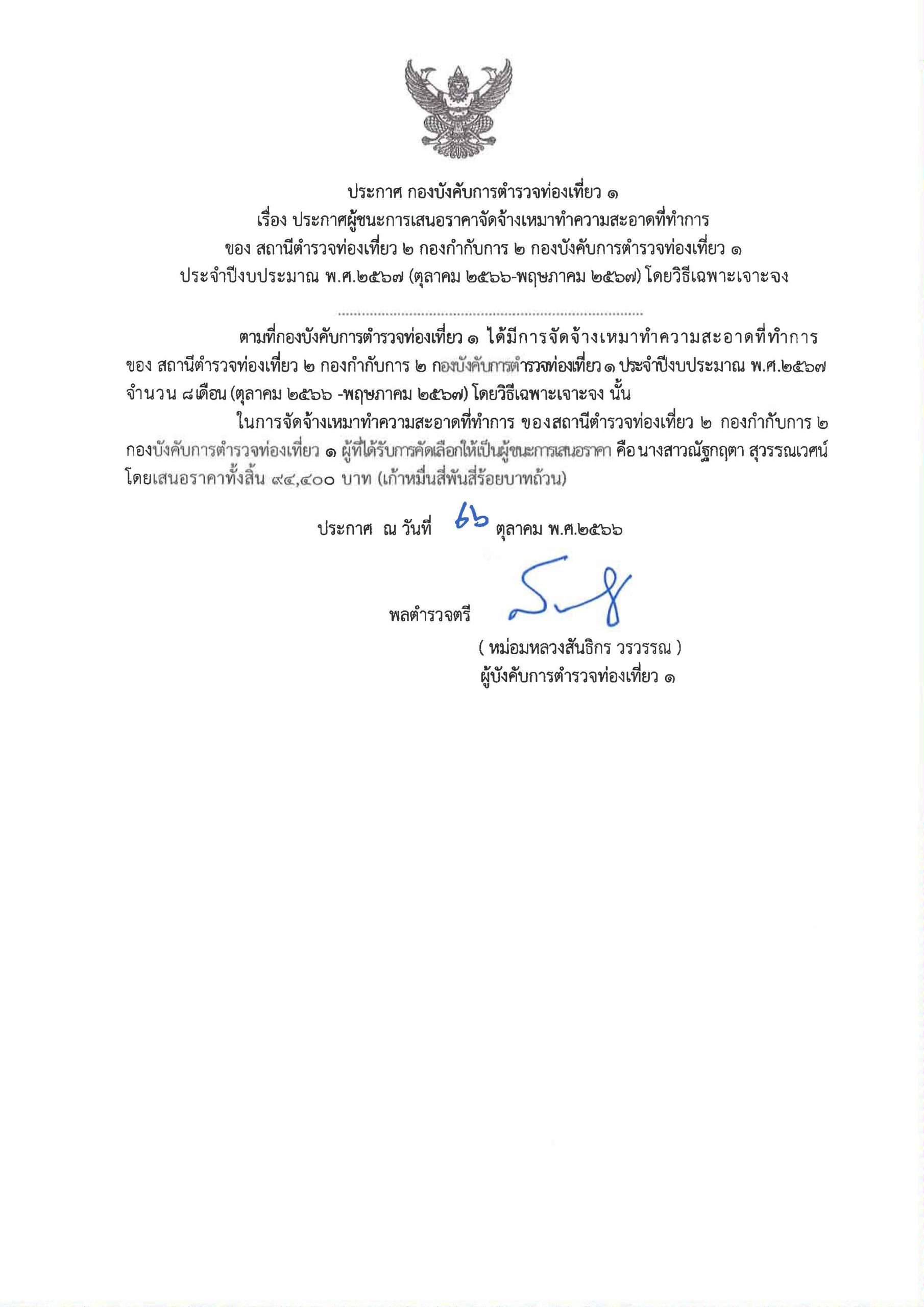ประกาศ กองบังคับการตำรวจท่องเที่ยว 1 เรื่อง ประกาศผู้ชนะการเสนอราคาจัดจ้างเหมาทำความสะอาดที่ทำการของ ส.ทท.2 กก.2 บก.ทท.1 ประจำปีงบประมาณ พ.ศ.2567 โดยวีธีเฉพาะเจาะจง